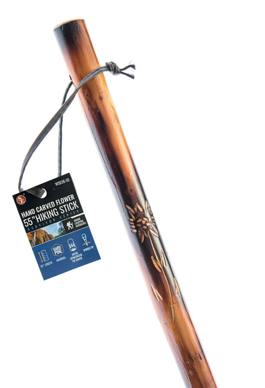 55" Flower Carving Handle Wooden Walking/Hiking Stick with Metal Tip for Better Traction