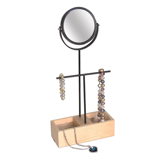 Expositor de metal negro con base de madera natural