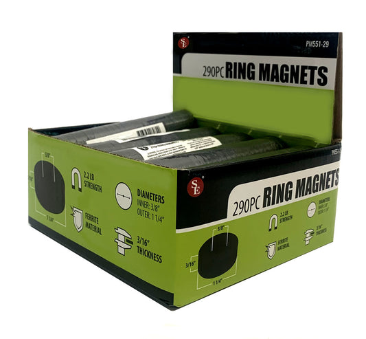 290-piece display of 1.1/4"/2.2LBS Ferrite Ring Magnets, Hole Size 3/8", Thickness 3/16"